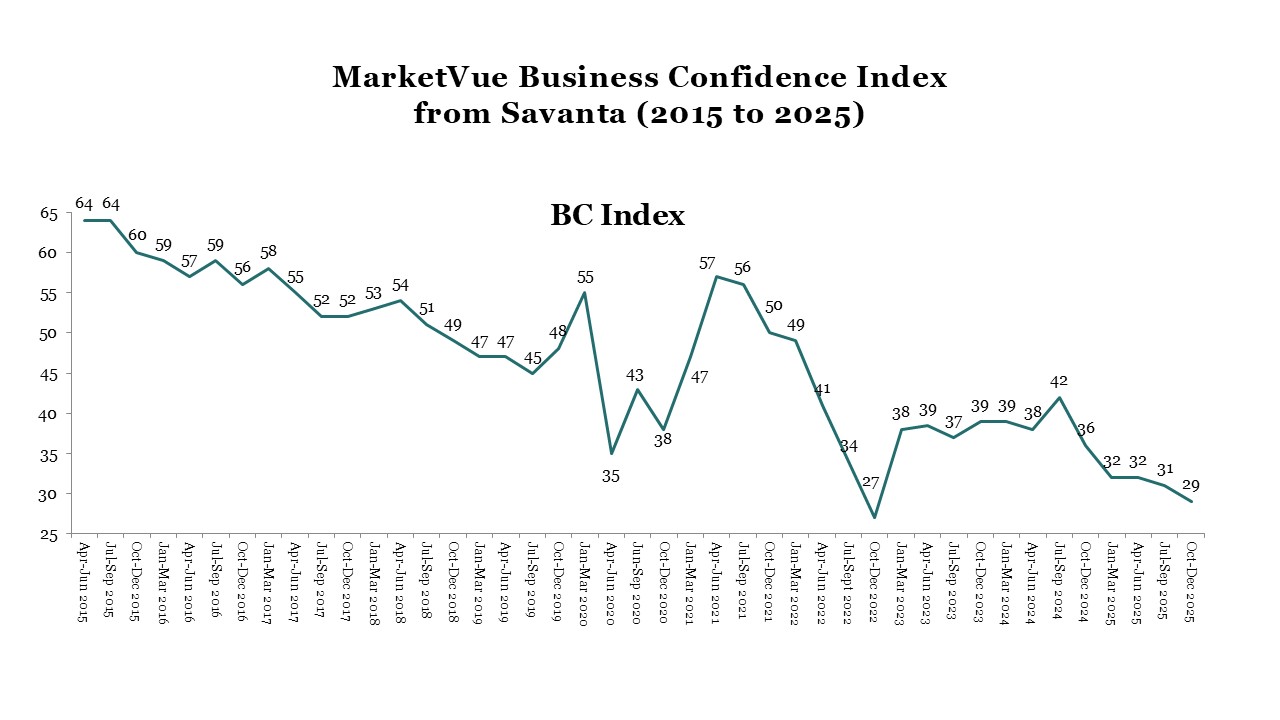 “UK Business Confidence has once again seen a decline in Q4 2025, continuing a negative trend over the last 15 months and closing what has been an eventful year for UK businesses. The Confidence Index currently sits at 29 – the second lowest measure recorded in over a decade of tracking (behind Q4 2022’s score of 27 amidst the turbulence of the short-lived Liz Truss government).