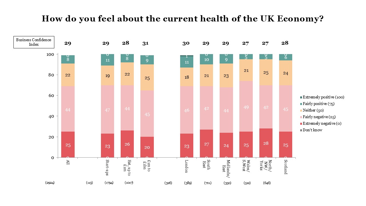 This quarter, confidence decreased significantly for larger businesses of £1m+ turnover (-3 points) and for established businesses up to £1m (-3 points), with start-ups also seeing a slight decrease (-3 points).