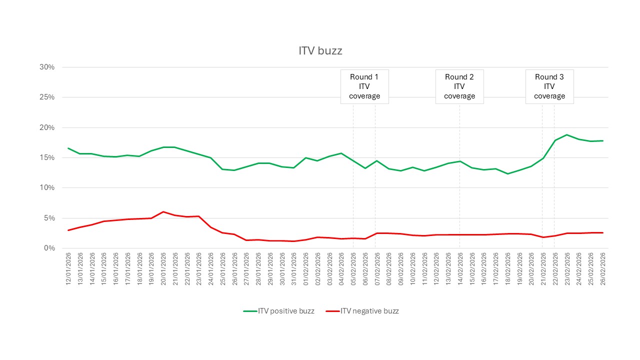 For ITV: Positive sentiment has risen as the tournament has progressed and peaked at 19% (so far) following the Round 3 fixtures. Negative sentiment has remained steady at a small minority of 2-3%