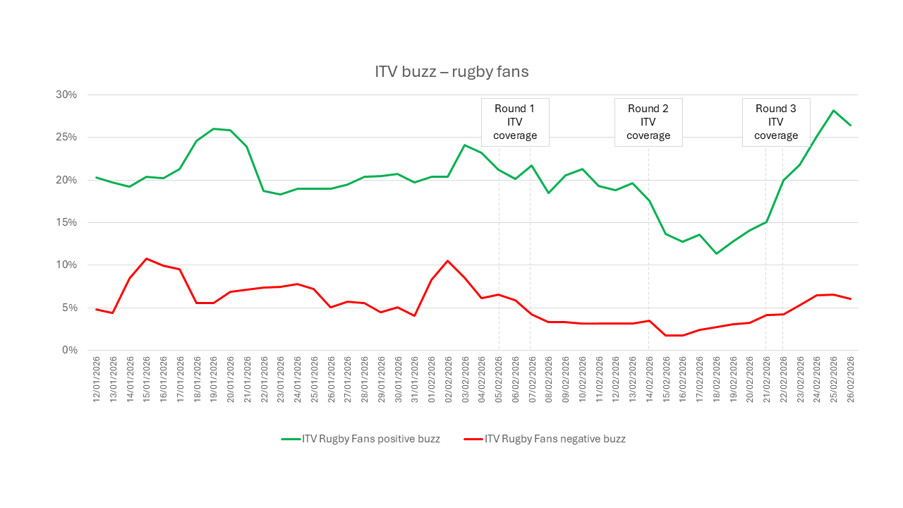 Among rugby fans specifically, sentiment has naturally been stronger. While positive buzz fell during the downtime between Rounds 2 and 3, it has recovered to achieve a new peak so far this year at 28%. Conversely, negative buzz has been in the minority, wavering between 2% and 7% – lower than pre-tournament levels observed in January.