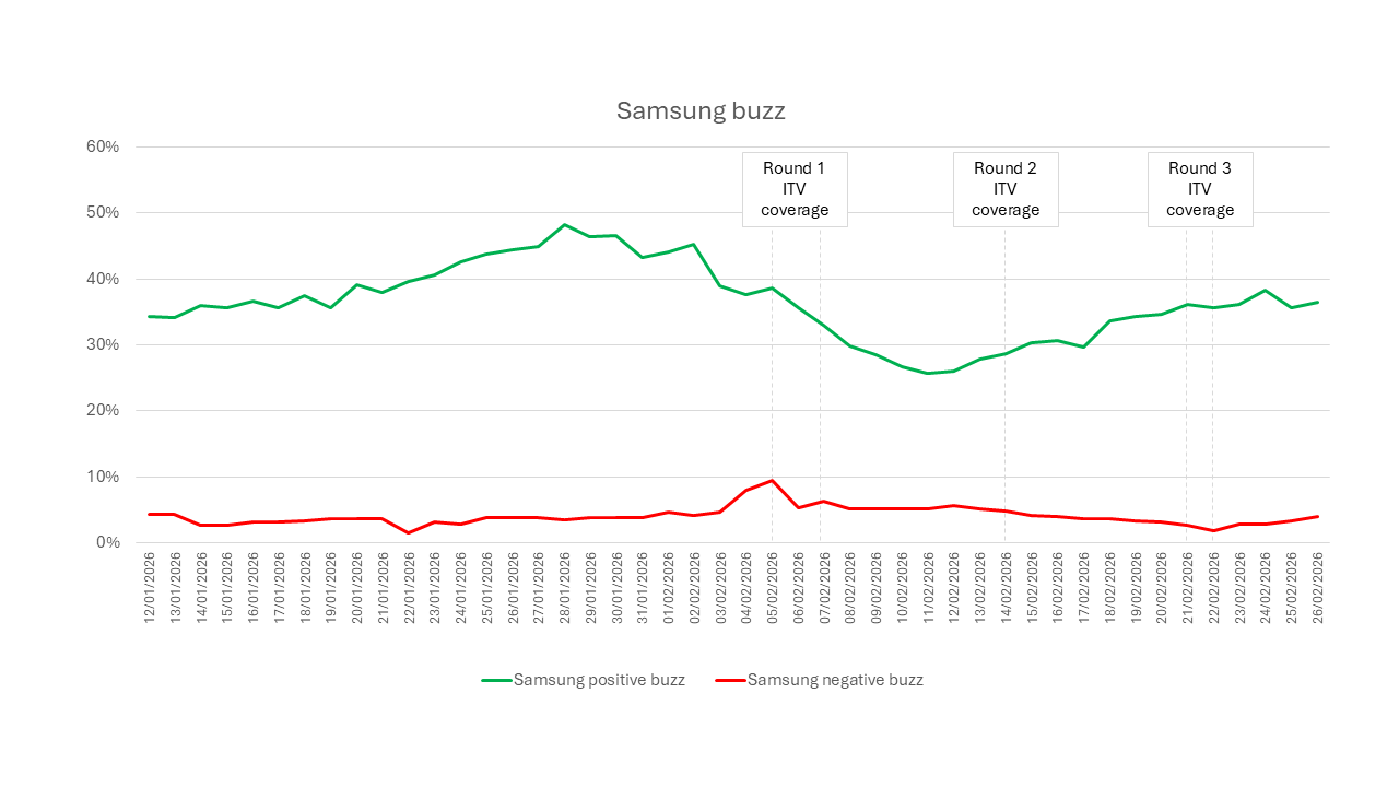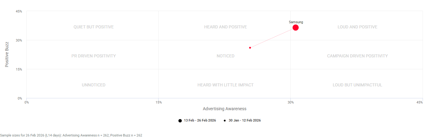 We also saw the relationship between awareness of Samsung advertising and positive buzz surrounding the brand shift in the right direction – the first part of February saw the brand categorised as ‘Noticed’, which progressed to ‘Loud & Positive’ as the month went on, i.e. both ad awareness and positive buzz have risen.